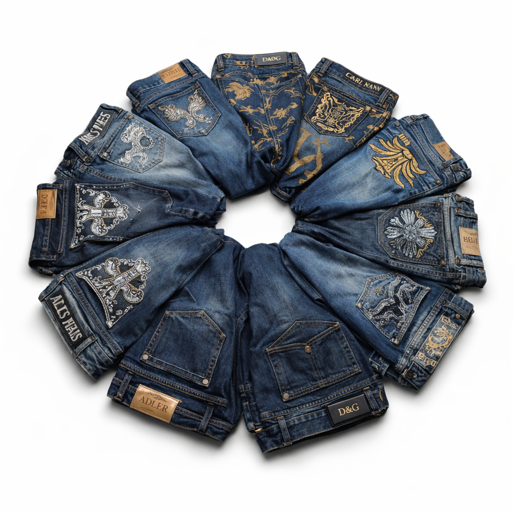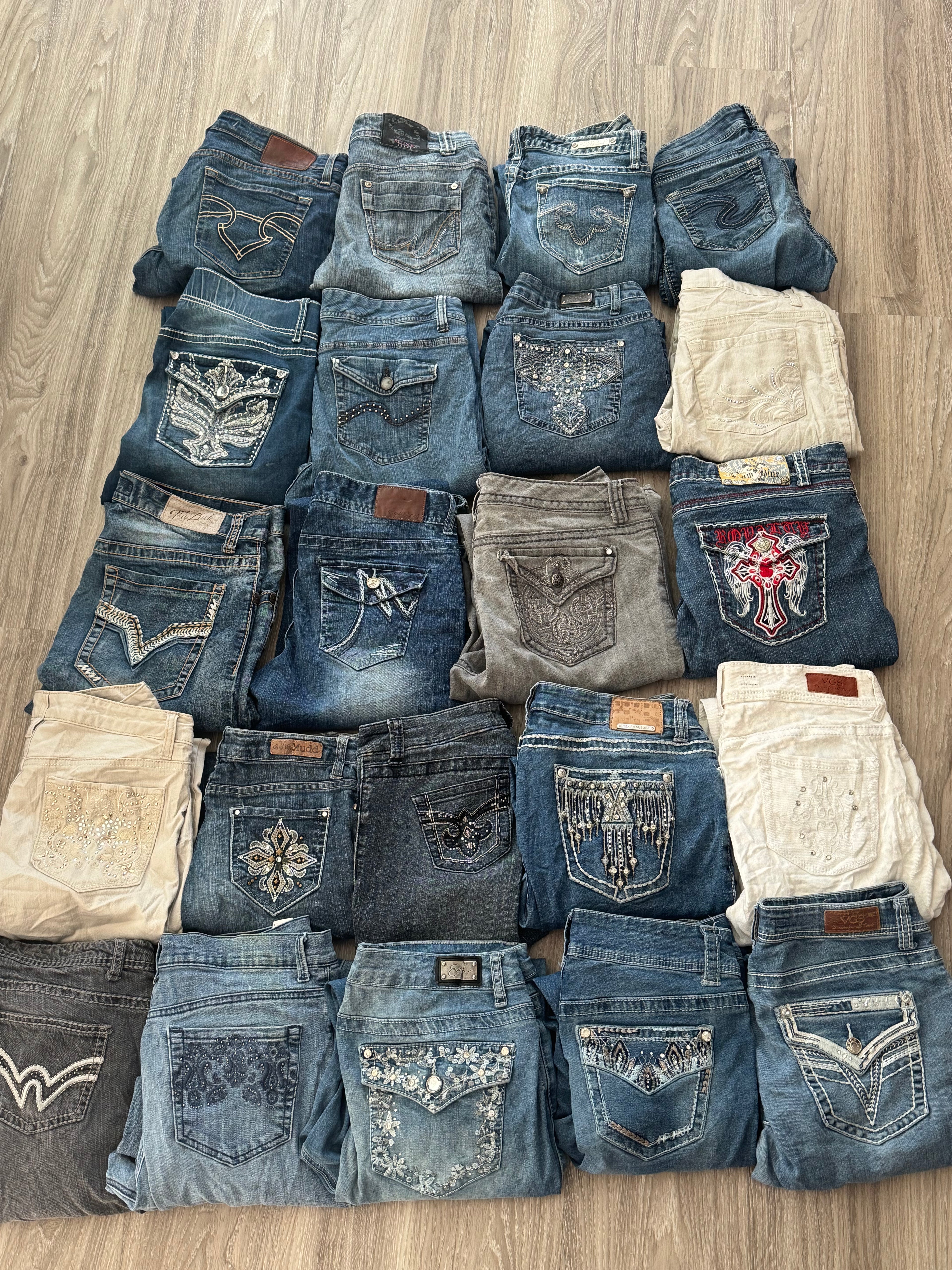 Rhinestone denim can be either sourced or designed by Miami Vintage.